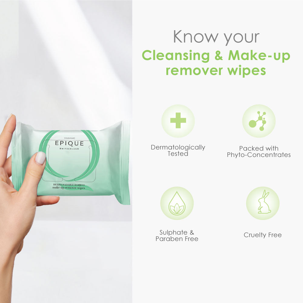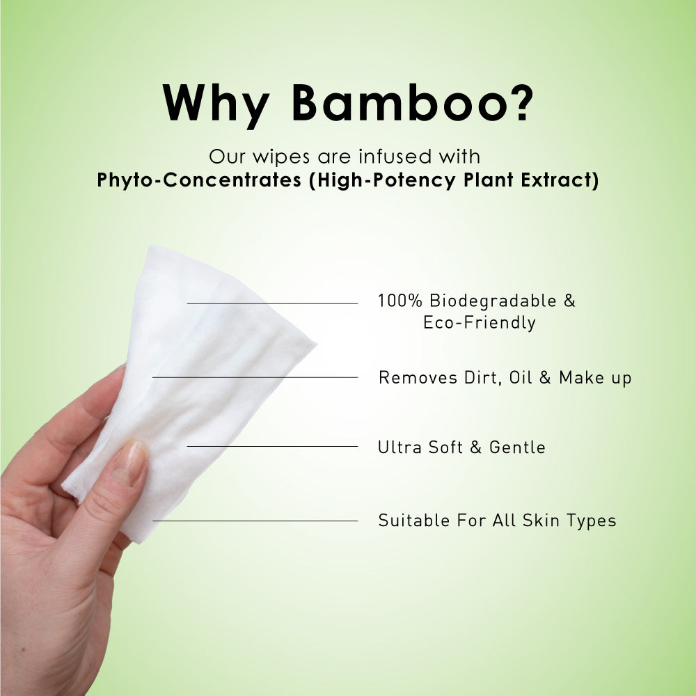 Our Biodegradable Bamboo Makeup Remover Wipes are made from 100% natural biodegradable, eco-friendly and sustainably sourced bamboo. It is also infused with Phyto-Concentrates (high-potency plant extracts), which moisturises and cleanses the skin in just one wipe.